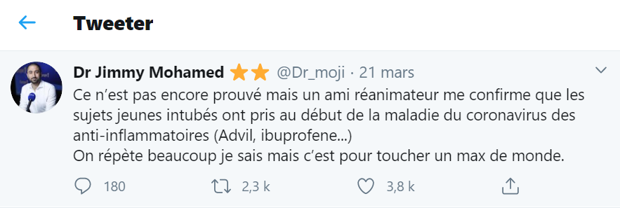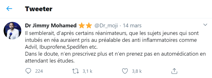 De plus, depuis quand diffuse-t-on des infos aussi cruciales via Twitter sans aucun recul ni étude sérieuse ? Alors que l’on demande des études très complexes au Pr Raoult pour démontrer l’efficacité de l’hydroxychloroquine, ces irresponsables comme le Dr Jimmy Mohamed et tant d’autres, ont juste eu besoin d’une rumeur pour interdire l’utilisation d’un médicament essentiel, avec des conséquences dramatiques sur la santé des malades condamnés à ne prendre que du paracétamol pour combattre une fièvre qui est elle-même essentielle à la destruction du virus lorsqu’elle est maîtrisée.