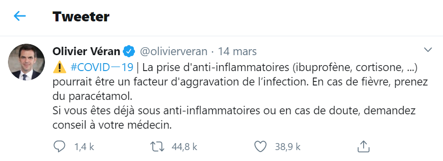 Voici un acte politique et médical, une décision lourde de conséquence, qui a été prise par un ministre incompétent et reprise par des médecins amateurs : interdire la prise d’anti-inflammatoire sans aucune espèce d’étude scientifique de quelque sorte que ce soit, juste une rumeur ! Pourtant, il est de notoriété publique que les infections respiratoires, notamment les alvéolites, sont traitées par les anti-inflammatoires depuis toujours avec une couverture antibiotique ! Quand un ministre de la Santé ainsi que le site officiel du gouvernement commettent une telle erreur, il faut commencer à se poser les bonnes questions (d’ailleurs l’erreur est toujours présente sur leur site – mise à jour du 29.05.20) ! La même erreur a été commise par Doctissimo ou la Société Française de Phramacologie et Thérapeutique (toujours en ligne !)…
