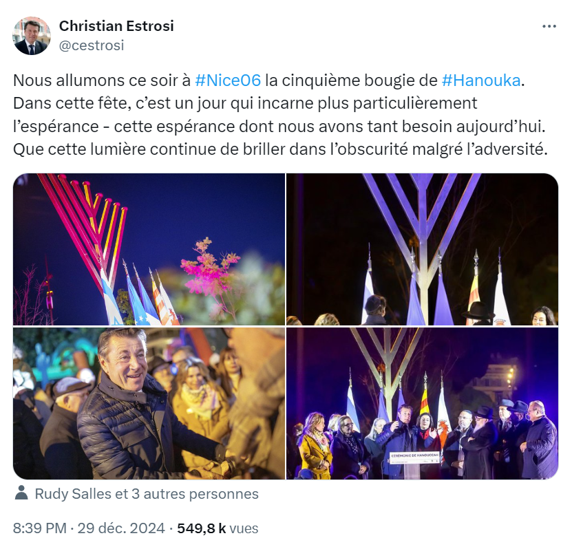 Nous allumons ce soir à #Nice06 la cinquième bougie de #Hanouka. Dans cette fête, c’est un jour qui incarne plus particulièrement l’espérance – cette espérance dont nous avons tant besoin aujourd’hui. Que cette lumière continue de briller dans l’obscurité malgré l’adversité. pic.twitter.com/JunTnNmr5C
