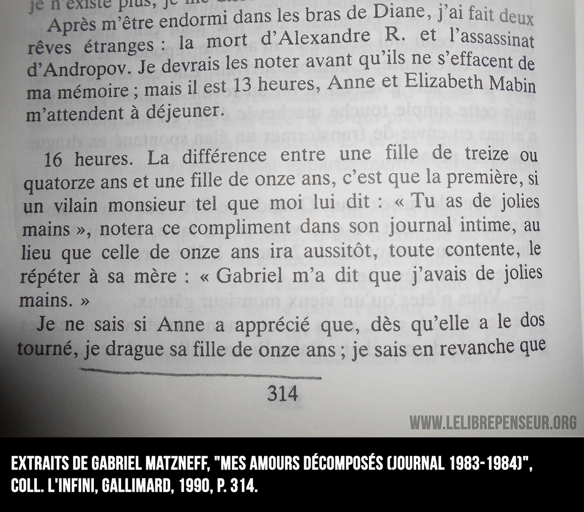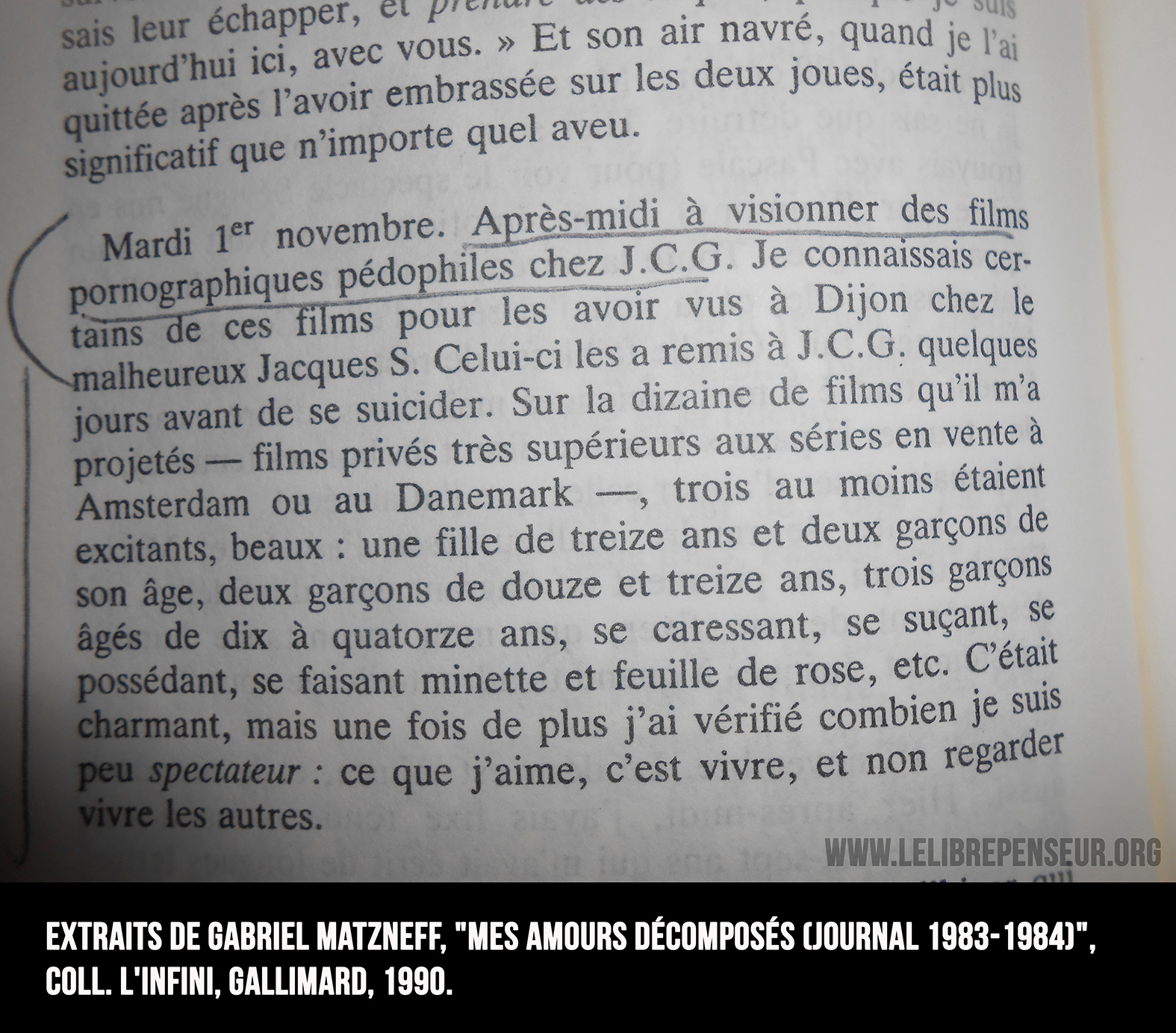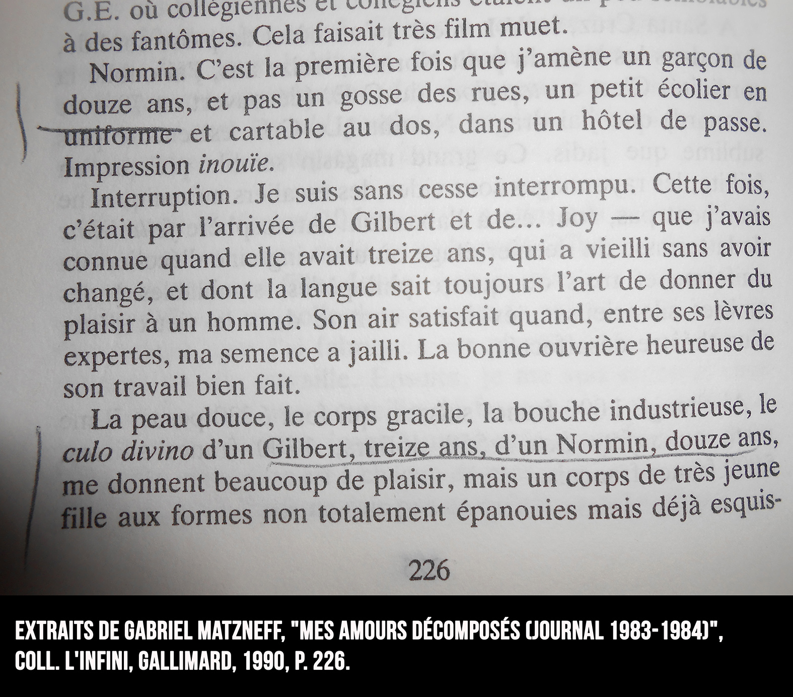 En réalité, tout ceci est bien connu de tous, ils savent parfaitement ce qu’ils font et, par notre silence honteux et notre totale inertie, nous sommes devenus les complices impardonnables de ces criminels ! Ne pas oublier que Matzneff a été un témoin de l’affaire du pédocriminel récidiviste J. Dugué !!!