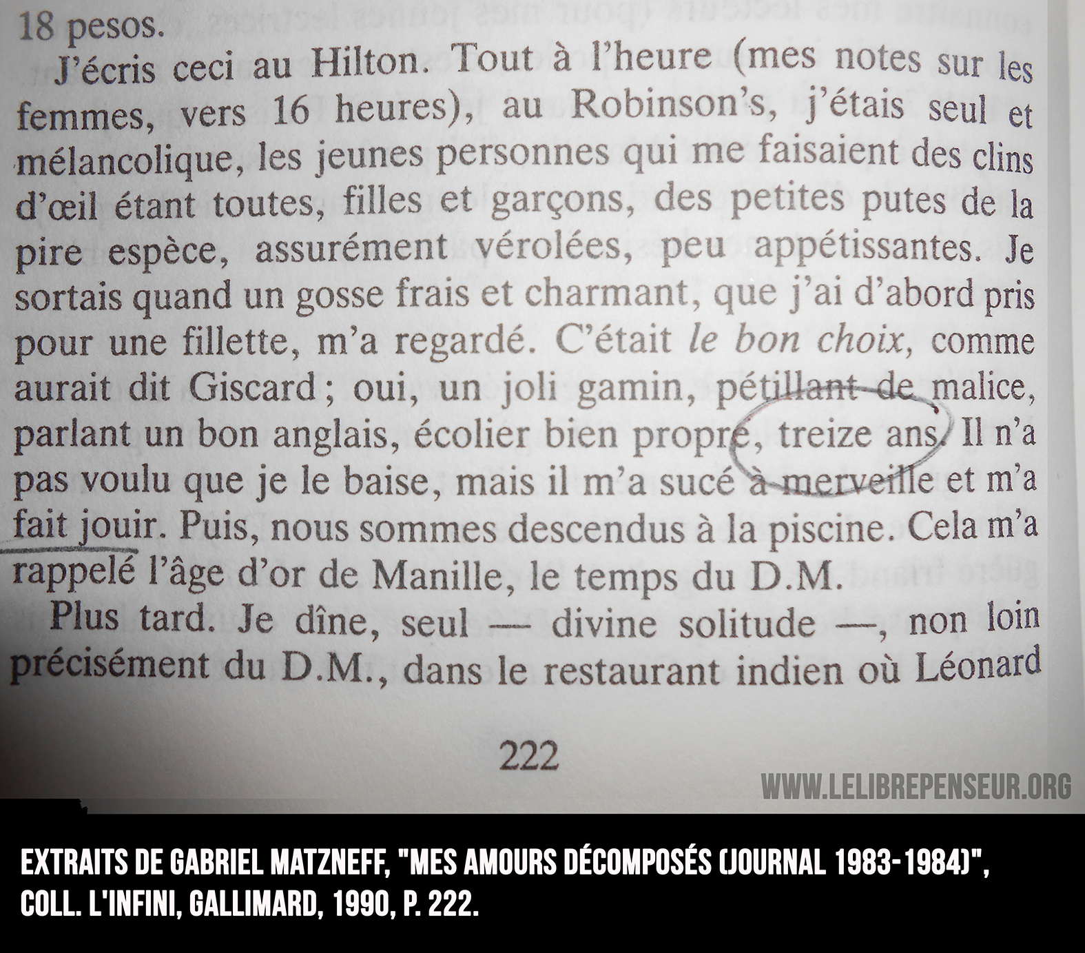 Grosal et Alain de Benoist doivent être heureux et jubiler de bonheur en voyant cette racaille pédocriminelle collectionner les récompenses littéraires, dont il faut croire qu’elles sont décernées au prorata du nombre de petits garçons innocents attirés dans le traquenard de cette vermine, au vu et au su de tous : police, justice, médias… tous complices criminels. Il est étrange que cette récompense soit attribuée à cet étron au moment où l’actualité fait état d’images pédopornographiques détenues par d' »honorables » professeurs des écoles, s’occupant de très jeunes enfants, et qui ont misérablement forfait à leur devoir et à leur honneur. Il est également étrange que cette « saleté » de distinction, destinée initialement aux auteurs n’ayant rien reçu, soit attribuée à cette crapule alors que ce pédocriminel a déjà obtenu le prix Renaudot essai en 2013 ! Dormez poings fermés petites gens, point de complot à l’horizon, juste des pédocriminels haut placés qui se protègent, s’autocongratulent et s’encensent mutuellement. L’écrivain Jean-François Colosimo qui, hier encore sur les plateaux télé, défendait les chrétiens d’Orient, nous gratifiera d’une sortie extraordinaire, époustouflante : « Matzneff fait partie de la race des écrivains dont le personnage ne se distingue pas de l’œuvre » ! Rien que ça ! Oui, effectivement, Matzneff fait partie d’une race de fils de chiens de pédocriminels !