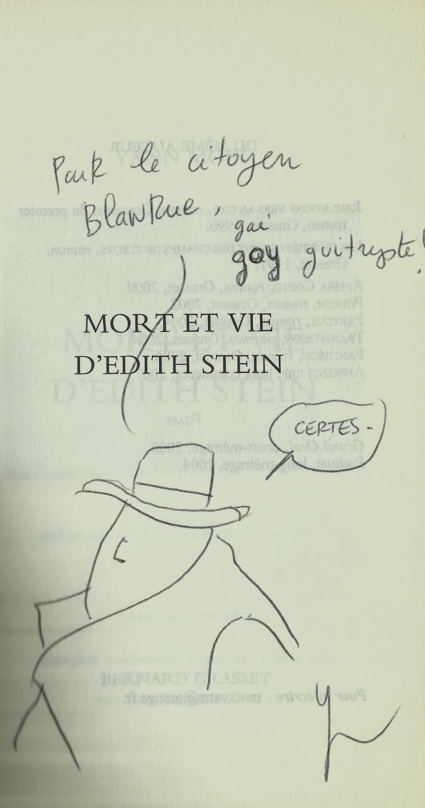 Deux dédicaces amusantes, datant de 2006 et 2008 : l’une sur Panthéon, consacré à François Mitterrand, l’autre sur Mort et vie d’Édith Stein, histoire de la célèbre juive devenue carmélite et censée avoir été gazée à Auschwitz.