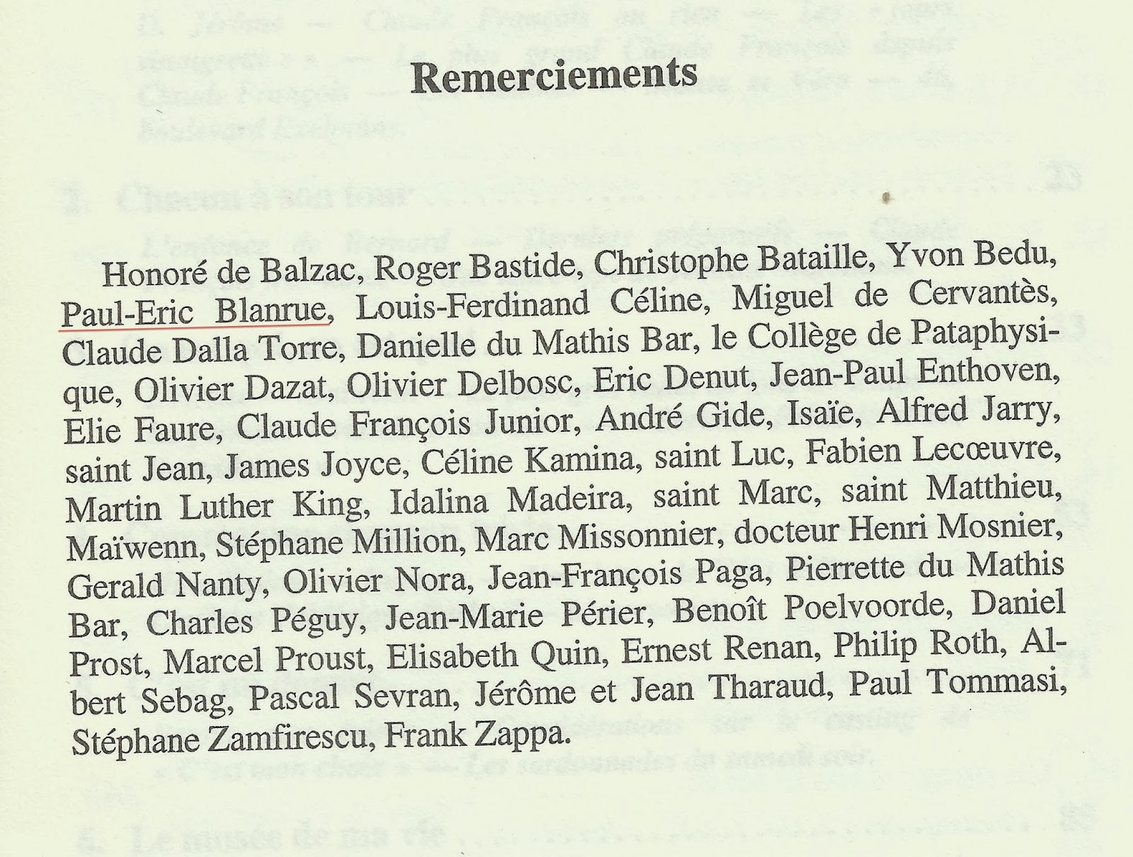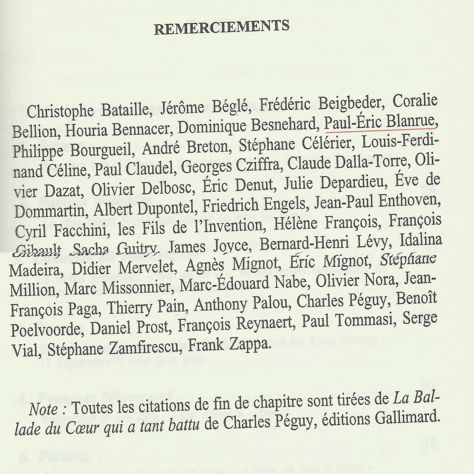 En 2004, Blanrue est à nouveau remercié, cette fois pour sa collaboration au roman Partouz où il figure au côté de Marc-Édouard Nabe et… de BHL !