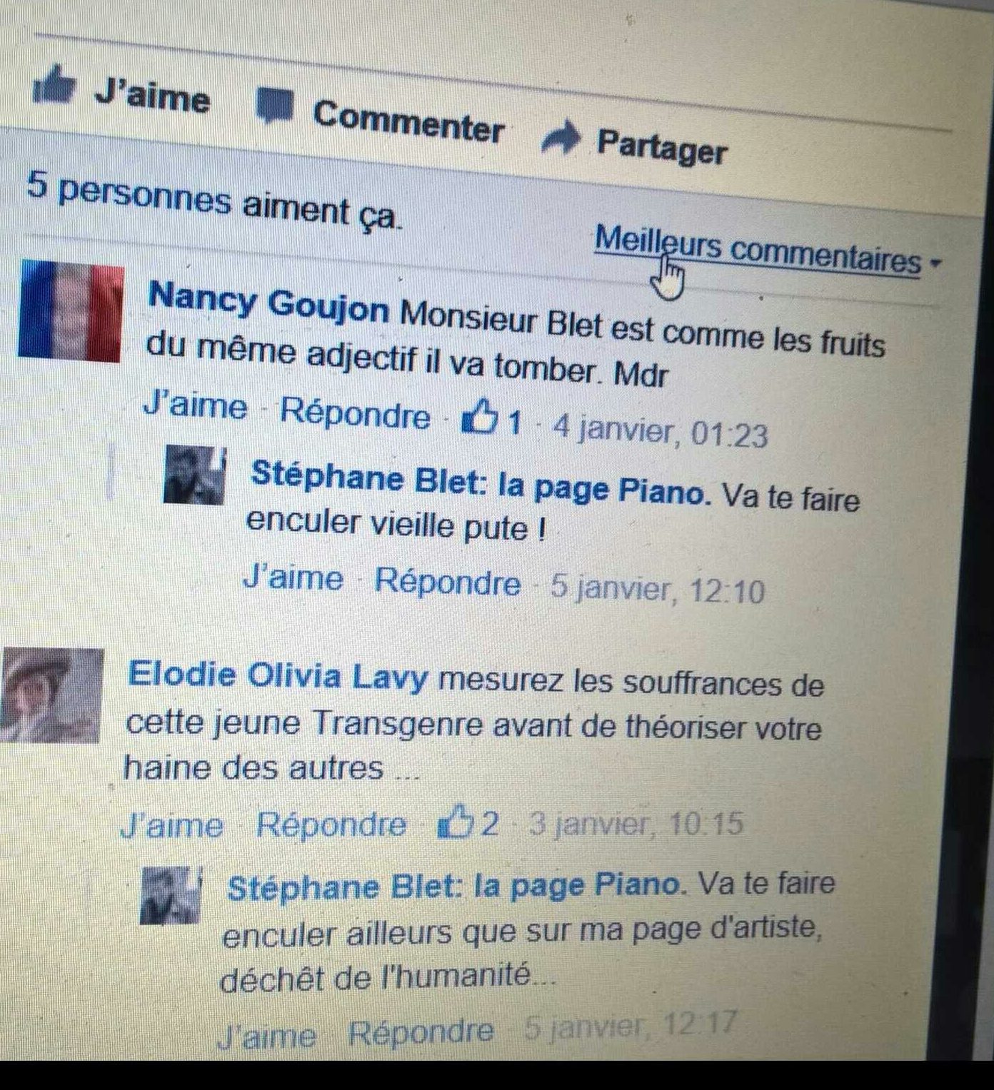 Comment passer sous silence les messages orduriers qu’il a envoyés à Olivier Mukuna sur sa messagerie Facebook ? Toujours très matinal, sans avoir néanmoins dormi (à 04h00, comme d’hab’ !), sous l’effet d’on ne sait quelle substance lui donnant le courage que n’a jamais dans la vie réelle ce fuyard réputé pour sa couardise, il enverra à Olivier Mukuna une série de messages l’insultant grossièrement et le traitant de « pauvre » n’ayant pas réussi, contrairement à lui, le gros bourgeois !!! Il n’y a plus de question à se poser, concernant la santé mentale de ce sinistre gugusse qui se prend pour un jeunot de 15 ans, installé derrière son clavier très tard dans la nuit noire.