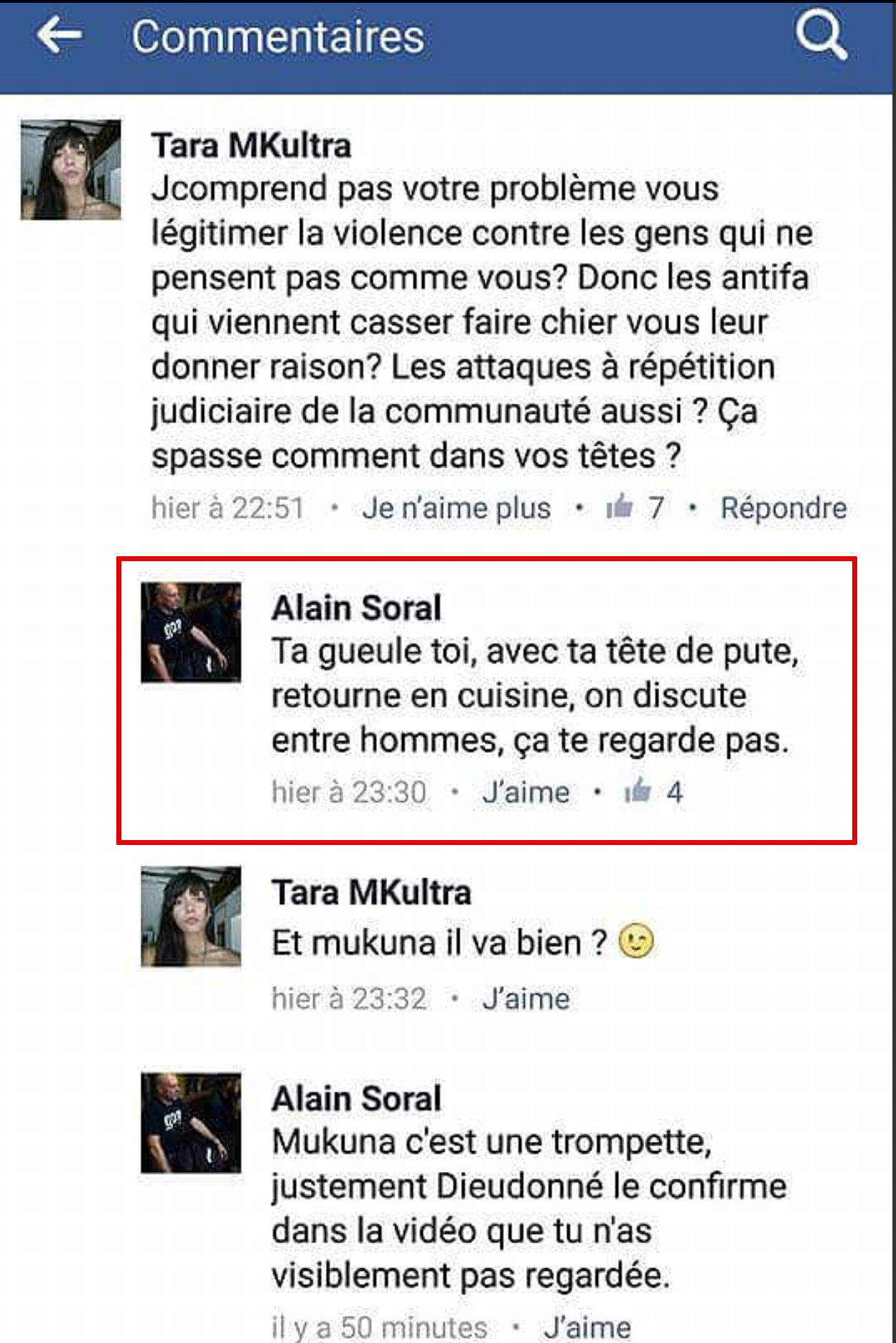Juste avant l’élection présidentielle, en bon salarié du FN et de Philippe Péninque, le gourou est venu tenter une dernière manipulation destinée à récupérer l’électorat maghrébin et musulman en général. Malheureusement pour lui, toute sa comédie a été éventée, et le plus jeune des collégiens pré-pubères aura compris la manœuvre grossière. Il lui reste, comme ultime recours, l’arme des faibles, l’insulte et la menace comme le démontre la capture écran de sa page Facebook, repère de trolls, faux comptes et autres dégénérés de son espèce. Mais attention Soral, Salim ce n’est pas Conversano !